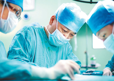 手術(shù)臺(tái)上的江學(xué)慶(中)。 武漢市中心醫(yī)院供圖