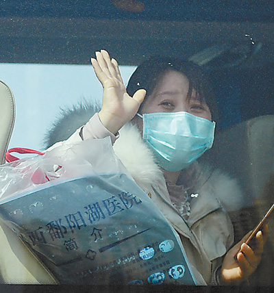2月22日,江西中醫(yī)藥大學附屬醫(yī)院撫生院區(qū),11名此前由其他醫(yī)療機構轉入該院的新冠肺炎患者治愈出院,其中有8人在該院接受了中醫(yī)治療,3人接受中西醫(yī)結合治療。圖為出院的病人向醫(yī)護人員揮手告別。時 雨攝(影像中國)
