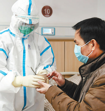 2月18日,在江西中醫(yī)藥大學附屬醫(yī)院撫生院區(qū)新冠肺炎患者的隔離病房內,護士將中藥湯劑端給患者。時 雨攝(影像中國)