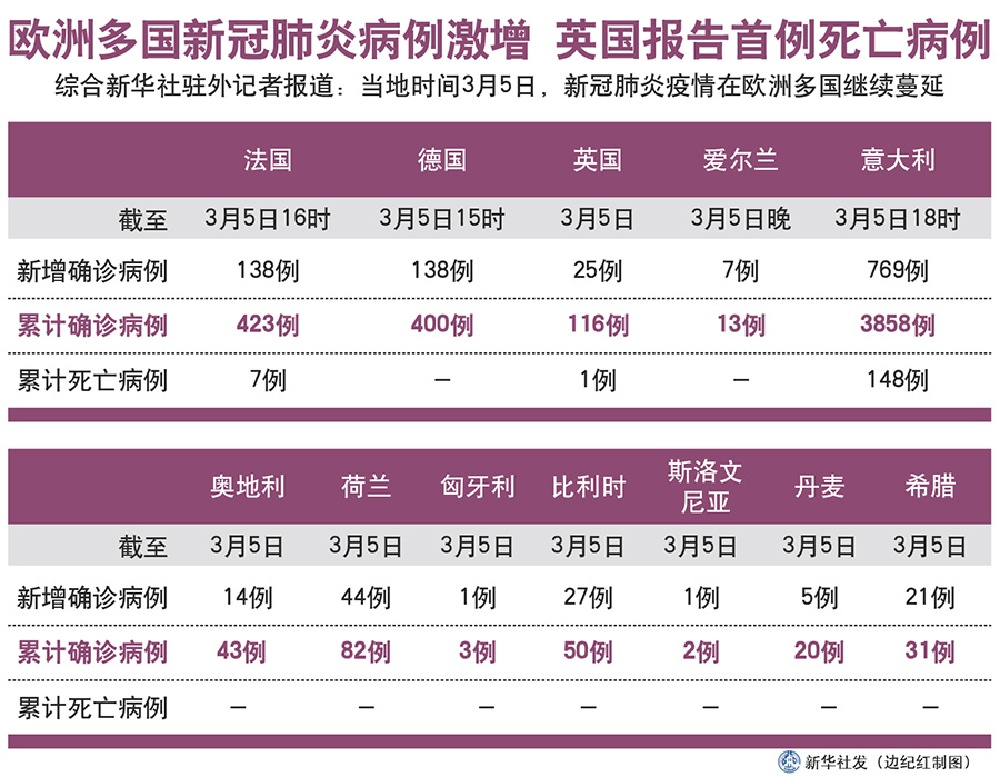 新華社北京3月6日電 綜合新華社駐外記者報道:5日,新冠肺炎疫情在歐洲多國繼續(xù)蔓延。除意大利外,法國和德國確診病例都有較大幅度增加,英國報告首例死亡病例。