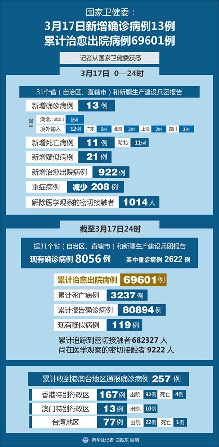 截至3月17日24時,據(jù)31個?。ㄗ灾螀^(qū)、直轄市)和新疆生產(chǎn)建設(shè)兵團報告,現(xiàn)有確診病例8056例(其中重癥病例2622例),累計治愈出院病例69601例,累計死亡病例3237例,累計報告確診病例80894例,現(xiàn)有疑似病例119例。累計追蹤到密切接觸者682327人,尚在醫(yī)學(xué)觀察的密切接觸者9222人。