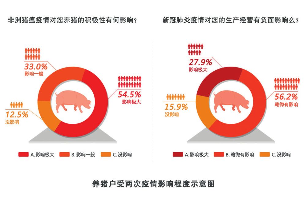 調(diào)查顯示,54.5%的養(yǎng)豬戶認(rèn)為非洲豬瘟疫情對(duì)養(yǎng)豬的積極性影響極大,防護(hù)成本高、造成虧損、仔豬成本高,是養(yǎng)豬戶反映非洲豬瘟疫情帶來(lái)的最強(qiáng)烈影響,27.9%的養(yǎng)豬戶認(rèn)為新冠肺炎疫情對(duì)生產(chǎn)經(jīng)營(yíng)的負(fù)面影響極大。(見(jiàn)圖1)