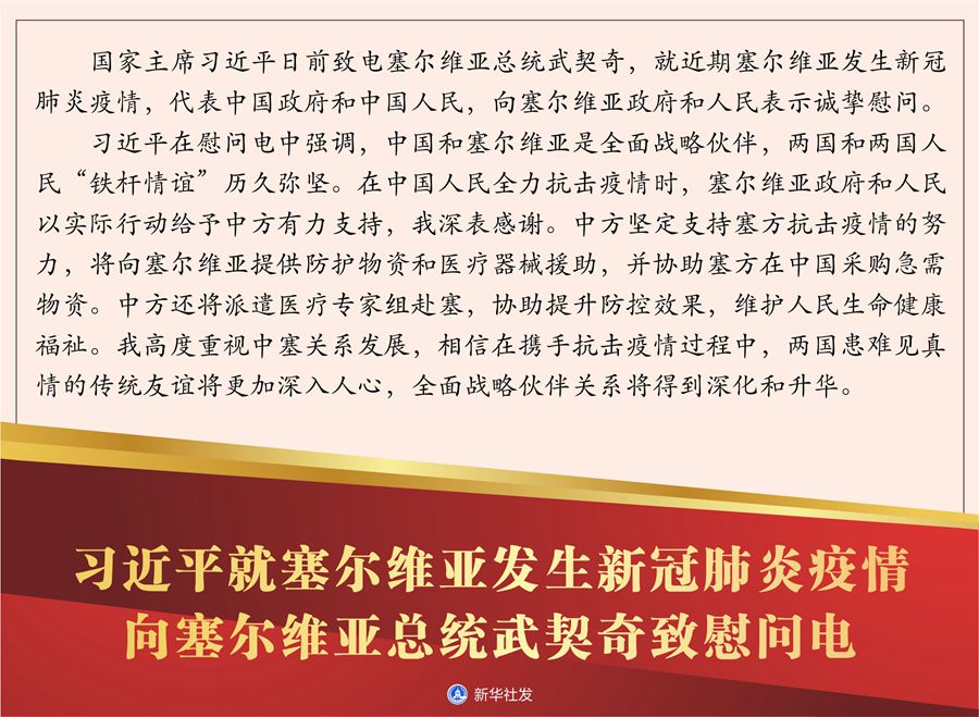習近平在慰問電中強調,中國和塞爾維亞是全面戰(zhàn)略伙伴,兩國和兩國人民“鐵桿情誼”歷久彌堅。在中國人民全力抗擊疫情時,塞爾維亞政府和人民以實際行動給予中方有力支持,我深表感謝。中方堅定支持塞方抗擊疫情的努力,將向塞爾維亞提供防護物資和醫(yī)療器械援助,并協(xié)助塞方在中國采購急需物資。中方還將派遣醫(yī)療專家組赴塞,協(xié)助提升防控效果,維護人民生命健康福祉。我高度重視中塞關系發(fā)展,相信在攜手抗擊疫情過程中,兩國患難見真情的傳統(tǒng)友誼將更加深入人心,全面戰(zhàn)略伙伴關系將得到深化和升華。