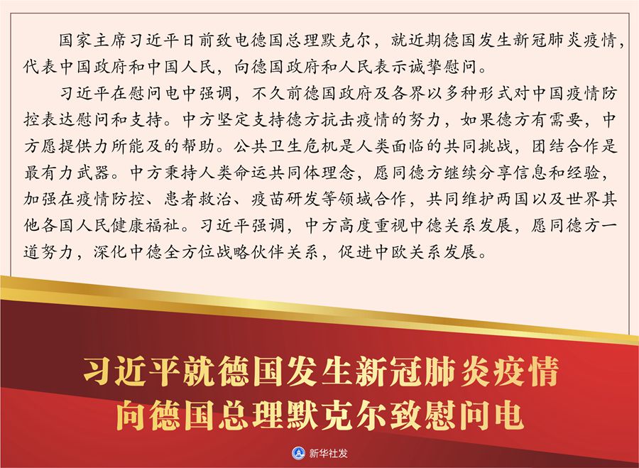 習(xí)近平在慰問(wèn)電中強(qiáng)調(diào),不久前德國(guó)政府及各界以多種形式對(duì)中國(guó)疫情防控表達(dá)慰問(wèn)和支持。中方堅(jiān)定支持德方抗擊疫情的努力,如果德方有需要,中方愿提供力所能及的幫助。公共衛(wèi)生危機(jī)是人類面臨的共同挑戰(zhàn),團(tuán)結(jié)合作是最有力武器。中方秉持人類命運(yùn)共同體理念,愿同德方繼續(xù)分享信息和經(jīng)驗(yàn),加強(qiáng)在疫情防控、患者救治、疫苗研發(fā)等領(lǐng)域合作,共同維護(hù)兩國(guó)以及世界其他各國(guó)人民健康福祉。習(xí)近平強(qiáng)調(diào),中方高度重視中德關(guān)系發(fā)展,愿同德方一道努力,深化中德全方位戰(zhàn)略伙伴關(guān)系,促進(jìn)中歐關(guān)系發(fā)展。