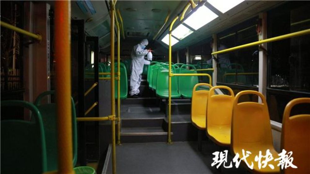 3月18日晚上8點(diǎn),穿好防護(hù)服的陳強(qiáng)開始對405路公交車進(jìn)行全方位消毒,車身、扶手、座位,任何一個角落都不放過。