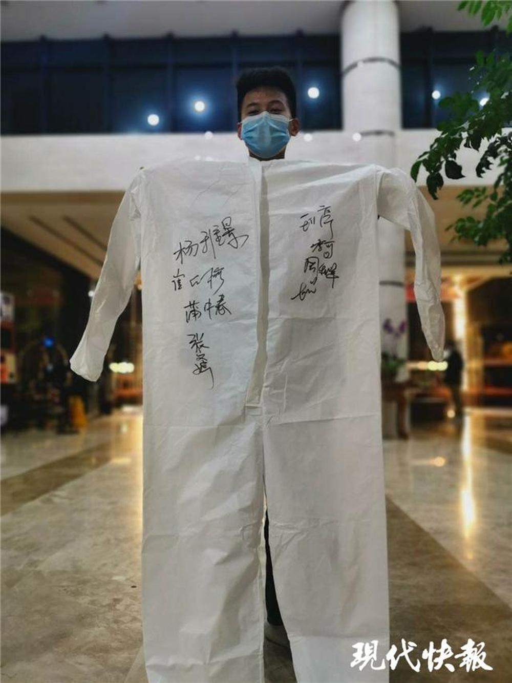 “其實他們都比我大,叫我強(qiáng)哥都不敢應(yīng)?!标悘?qiáng)靦腆地笑著。陳強(qiáng)還展示了一件特殊的防護(hù)服,上面寫滿了他接送的醫(yī)護(hù)人員名字?!拔蚁M词顾麄冏吡耍乙材苡浀盟麄?。”