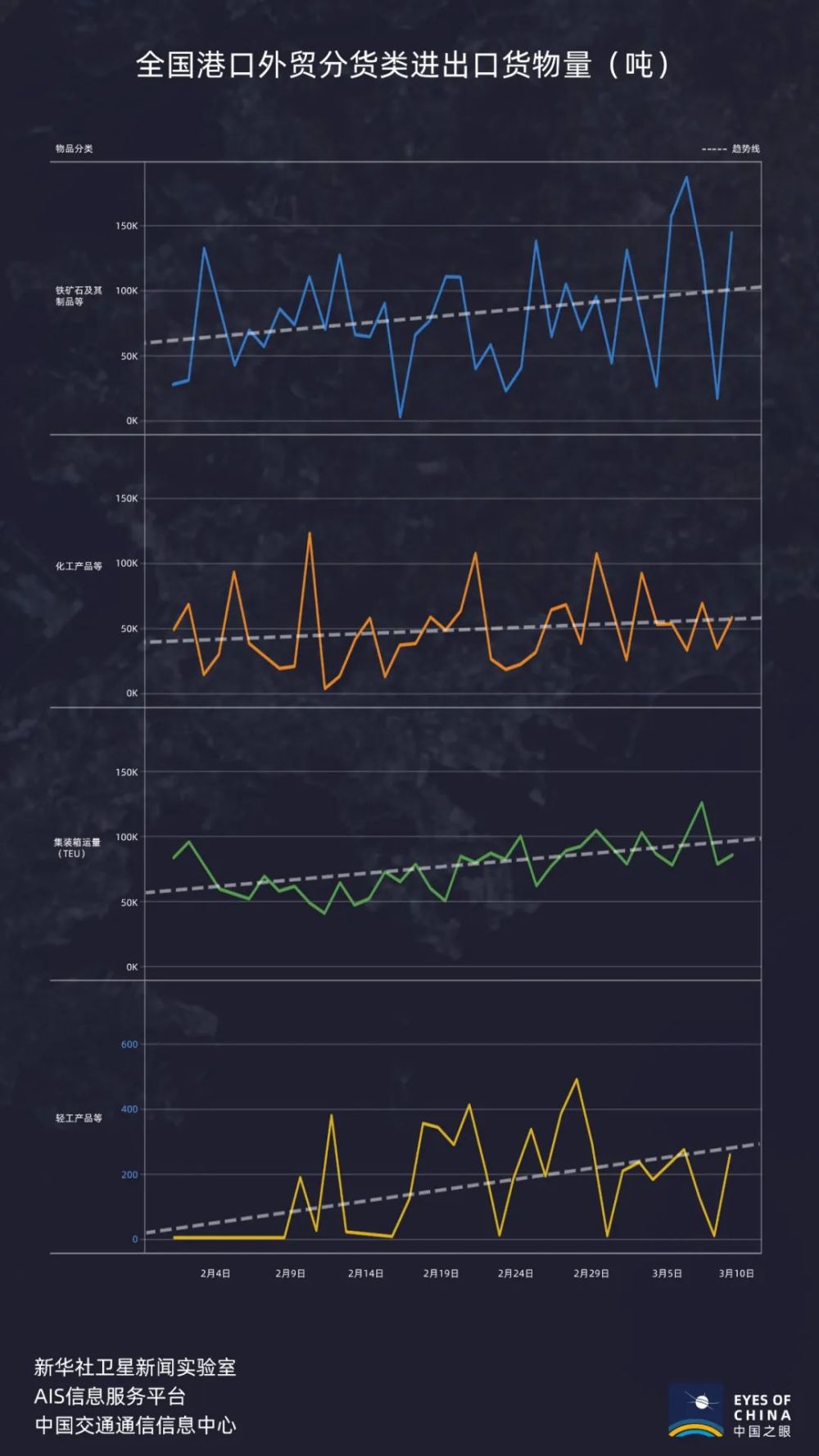 通過衛(wèi)星等方式獲得的中國沿海、內(nèi)河船舶軌跡(不含港澳臺地區(qū)),3月中旬相比2月下旬,渤海灣至長江口,以及北部灣區(qū)域,船舶航跡明顯擴(kuò)展,說明船舶出港、航行的活躍度大大提升。
