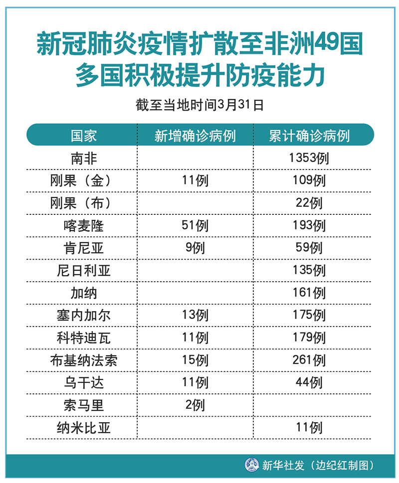 3月31日,塞拉利昂和布隆迪分別首次報告了新冠肺炎確診病例;坦桑尼亞、博茨瓦納、塞內(nèi)加爾和剛果(布)均報告了首例新冠肺炎死亡病例;剛果(金)確診病例過百。