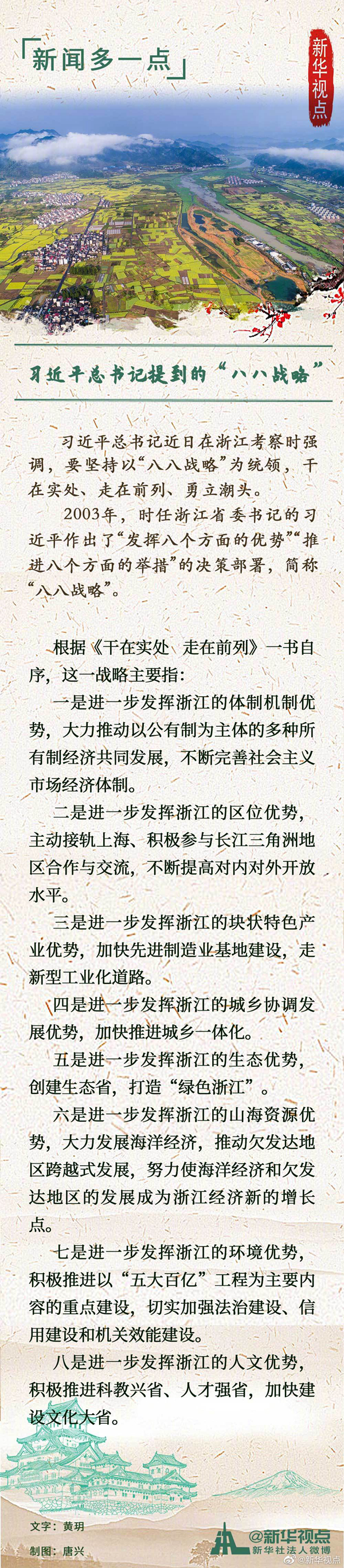 2003年,時(shí)任浙江省委書(shū)記的習(xí)近平作出了“發(fā)揮八個(gè)方面的優(yōu)勢(shì)”“推進(jìn)八個(gè)方面的舉措”的決策部署,簡(jiǎn)稱“八八戰(zhàn)略”。