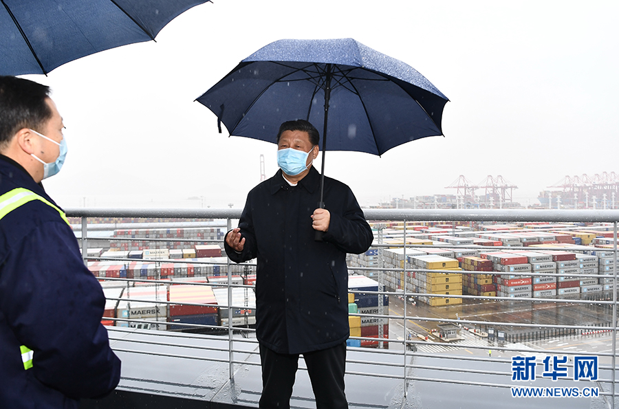 3月29日,中共中央總書記、國家主席、中央軍委主席習(xí)近平在浙江考察調(diào)研。這是習(xí)近平在寧波舟山港穿山港區(qū)碼頭了解港口復(fù)工復(fù)產(chǎn)情況。 新華社記者 申宏 攝