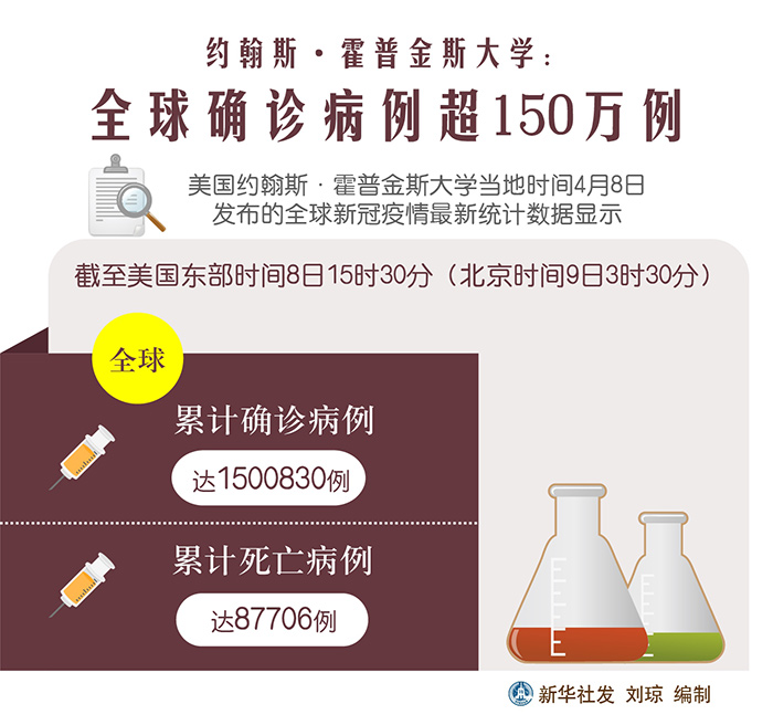 新華社紐約4月8日電? 美國(guó)約翰斯·霍普金斯大學(xué)8日發(fā)布的新冠疫情最新統(tǒng)計(jì)數(shù)據(jù)顯示,全球確診病例累計(jì)超過150萬例。