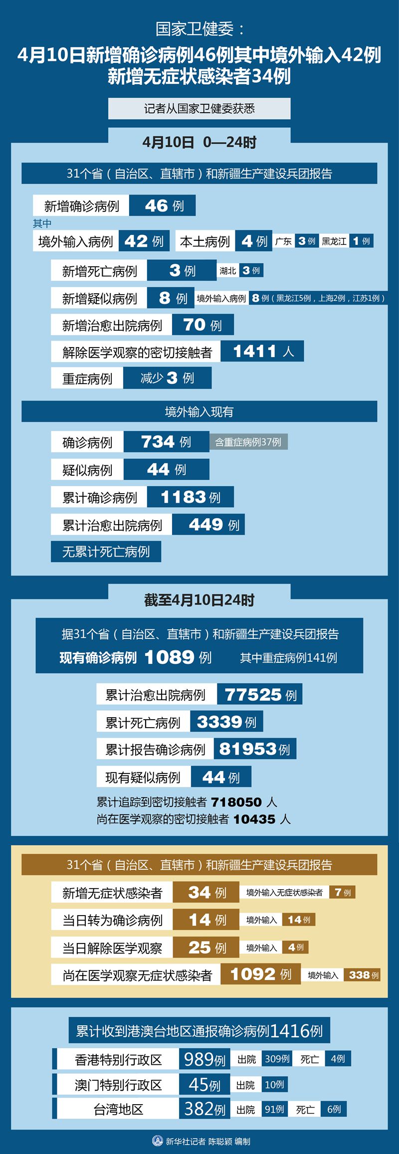 截至4月10日24時,據(jù)31個省(自治區(qū)、直轄市)和新疆生產(chǎn)建設(shè)兵團(tuán)報告,現(xiàn)有確診病例1089例(其中重癥病例141例),累計治愈出院病例77525例,累計死亡病例3339例,累計報告確診病例81953例,現(xiàn)有疑似病例44例。累計追蹤到密切接觸者718050人,尚在醫(yī)學(xué)觀察的密切接觸者10435人。