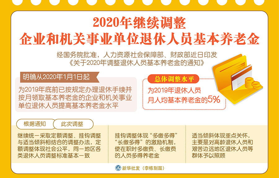 新華社北京4月17日電(記者王優(yōu)玲)經(jīng)國(guó)務(wù)院批準(zhǔn),人力資源社會(huì)保障部、財(cái)政部近日印發(fā)《關(guān)于2020年調(diào)整退休人員基本養(yǎng)老金的通知》,明確從2020年1月1日起,為2019年底前已按規(guī)定辦理退休手續(xù)并按月領(lǐng)取基本養(yǎng)老金的企業(yè)和機(jī)關(guān)事業(yè)單位退休人員提高基本養(yǎng)老金水平,總體調(diào)整水平為2019年退休人員月人均基本養(yǎng)老金的5%。