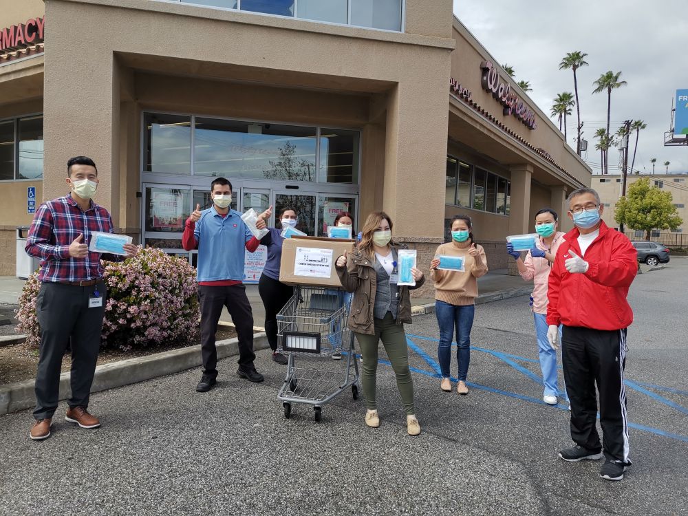 2020年4月7日,在美國洛杉磯縣天普市,美國南加州華人聯(lián)合總會(huì)代表向當(dāng)?shù)匾患宜幍昃栀?zèng)口罩時(shí)合影。(新華社發(fā))