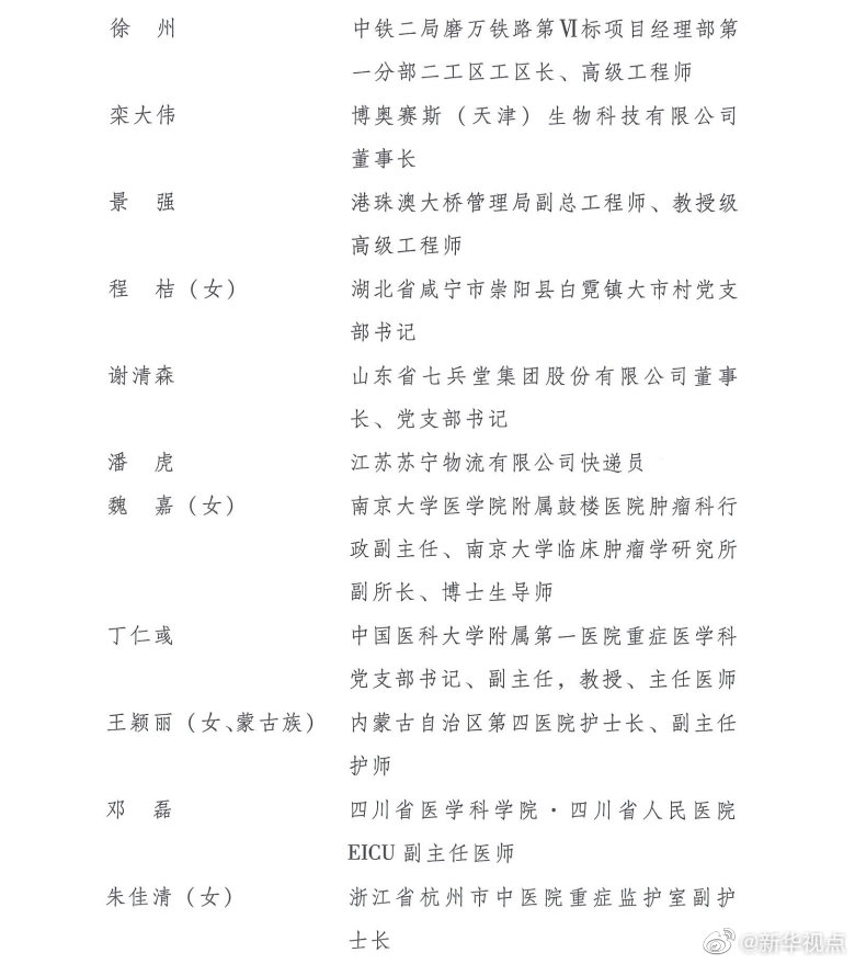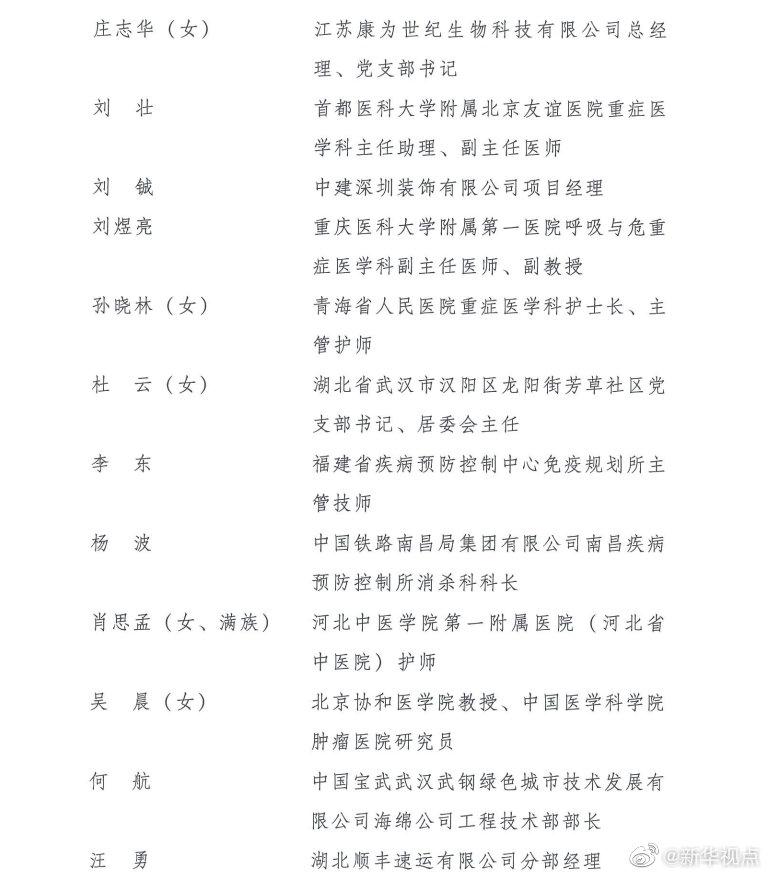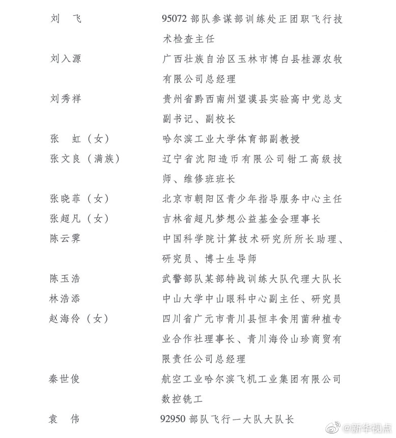 榮獲第24屆“中國青年五四獎?wù)隆钡姆謩e是:江蘇省南京市鼓樓區(qū)方家營消防救援站站長助理、三級消防長丁良浩,安徽省滁州市定遠(yuǎn)縣吳圩鎮(zhèn)西孔村黨總支第一書記王萌萌(女),廈門大學(xué)航空航天學(xué)院常務(wù)副院長、特聘教授、博士生導(dǎo)師尤延鋮,湖北省黃岡市羅田縣希望小學(xué)校長方榮(女),浙江每日互動網(wǎng)絡(luò)科技股份有限公司董事長兼總經(jīng)理、黨委書記方毅,浙江省杭州市拱墅區(qū)職業(yè)高級中學(xué)美發(fā)專業(yè)教師石丹(女),國家超級計算無錫中心副主任付昊桓,中國石油大港油田公司第二采油廠作業(yè)二區(qū)注采二組副組長馮萌萌(女),寧夏回族自治區(qū)石嘴山市中醫(yī)醫(yī)院副主任醫(yī)師朱斌,中國國家女子排球隊(duì)隊(duì)員、隊(duì)長朱婷(女),95072部隊(duì)參謀部訓(xùn)練處正團(tuán)職飛行技術(shù)檢查主任劉飛,廣西壯族自治區(qū)玉林市博白縣桂源農(nóng)牧有限公司總經(jīng)理劉入源,貴州省黔西南州望謨縣實(shí)驗(yàn)高中黨總支副書記、副校長劉秀祥,哈爾濱工業(yè)大學(xué)體育部副教授張虹(女),遼寧省沈陽造幣有限公司鉗工高級技師、維修班班長張文良(滿族),北京市朝陽區(qū)青少年指導(dǎo)服務(wù)中心主任張曉菲(女),吉林省超凡夢想公益基金會理事長張超凡(女),中國科學(xué)院計算技術(shù)研究所所長助理、研究員、博士生導(dǎo)師陳云霽,武警部隊(duì)某部特戰(zhàn)訓(xùn)練大隊(duì)代理大隊(duì)長陳玉浩,中山大學(xué)中山眼科中心副主任、研究員林浩添,四川省廣元市青川縣恒豐食用菌種植專業(yè)合作社理事長、青川海伶山珍商貿(mào)有限責(zé)任公司總經(jīng)理趙海伶(女),航空工業(yè)哈爾濱飛機(jī)工業(yè)集團(tuán)有限公司數(shù)控銑工秦世俊,92950部隊(duì)飛行一大隊(duì)大隊(duì)長袁偉,中鐵二局磨萬鐵路第Ⅵ標(biāo)項(xiàng)目經(jīng)理部第一分部二工區(qū)工區(qū)長、高級工程師徐州,博奧賽斯(天津)生物科技有限公司董事長欒大偉,港珠澳大橋管理局副總工程師、教授級高級工程師景強(qiáng),湖北省咸寧市崇陽縣白霓鎮(zhèn)大市村黨支部書記程桔(女),山東省七兵堂集團(tuán)股份有限公司董事長、黨支部書記謝清森,江蘇蘇寧物流有限公司快遞員潘虎,南京大學(xué)醫(yī)學(xué)院附屬鼓樓醫(yī)院腫瘤科行政副主任、南京大學(xué)臨床腫瘤學(xué)研究所副所長、博士生導(dǎo)師魏嘉(女),中國醫(yī)科大學(xué)附屬第一醫(yī)院重癥醫(yī)學(xué)科黨支部書記、副主任,教授、主任醫(yī)師丁仁彧,內(nèi)蒙古自治區(qū)第四醫(yī)院護(hù)士長、副主任護(hù)師王穎麗(女、蒙古族),四川省醫(yī)學(xué)科學(xué)院·四川省人民醫(yī)院EICU副主任醫(yī)師鄧?yán)?,浙江省杭州市中醫(yī)院重癥監(jiān)護(hù)室副護(hù)士長朱佳清(女),江蘇康為世紀(jì)生物科技有限公司總經(jīng)理、黨支部書記莊志華(女),首都醫(yī)科大學(xué)附屬北京友誼醫(yī)院重癥醫(yī)學(xué)科主任助理、副主任醫(yī)師劉壯,中建深圳裝飾有限公司項(xiàng)目經(jīng)理劉鋮,重慶醫(yī)科大學(xué)附屬第一醫(yī)院呼吸與危重癥醫(yī)學(xué)科副主任醫(yī)師、副教授劉煜亮,青海省人民醫(yī)院重癥醫(yī)學(xué)科護(hù)士長、主管護(hù)師孫曉林(女),湖北省武漢市漢陽區(qū)龍陽街芳草社區(qū)黨支部書記、居委會主任杜云(女),福建省疾病預(yù)防控制中心免疫規(guī)劃所主管技師李東,中國鐵路南昌局集團(tuán)有限公司南昌疾病預(yù)防控制所消殺科科長楊波,河北中醫(yī)學(xué)院第一附屬醫(yī)院(河北省中醫(yī)院)護(hù)師肖思孟(女、滿族),北京協(xié)和醫(yī)學(xué)院教授、中國醫(yī)學(xué)科學(xué)院腫瘤醫(yī)院研究員吳晨(女),中國寶武武漢武鋼綠色城市技術(shù)發(fā)展有限公司海綿公司工程技術(shù)部部長何航,湖北順豐速運(yùn)有限公司分部經(jīng)理汪勇,天津醫(yī)科大學(xué)總醫(yī)院呼吸與危重癥醫(yī)學(xué)科監(jiān)護(hù)室護(hù)士長沈悅好(女),西安交通大學(xué)第二附屬醫(yī)院急診科副主任、副主任醫(yī)師張正良,青島大學(xué)附屬醫(yī)院麻醉科主治醫(yī)師張孝田,湖南省湘潭市第一人民醫(yī)院重癥醫(yī)學(xué)科主任、副主任醫(yī)師易釗泉,湖南省懷化市志愿者協(xié)會副秘書長羅小小,華中科技大學(xué)同濟(jì)醫(yī)學(xué)院附屬同濟(jì)醫(yī)院心內(nèi)科副教授、副主任醫(yī)師周寧,甘肅藍(lán)天救援隊(duì)理事長、隊(duì)長於若飛,武漢大學(xué)中南醫(yī)院感染科護(hù)士長、主管護(hù)師胡慧(女),遼寧省沈陽橡膠研究設(shè)計院有限公司研發(fā)中心基礎(chǔ)理論與材料研究主任工程師姚秀超,山西醫(yī)科大學(xué)第一醫(yī)院神經(jīng)內(nèi)科護(hù)士長、主管護(hù)師唐珊(女),湖北省武漢市公安局江漢區(qū)分局警務(wù)指揮處民警涂可藹(土家族),廣州醫(yī)科大學(xué)附屬第一醫(yī)院重癥醫(yī)學(xué)科副主任醫(yī)師桑嶺,湖北省武漢市第三醫(yī)院重癥醫(yī)學(xué)科副主任醫(yī)師董芳(女),東南大學(xué)附屬中大醫(yī)院重癥醫(yī)學(xué)科主任醫(yī)師潘純。