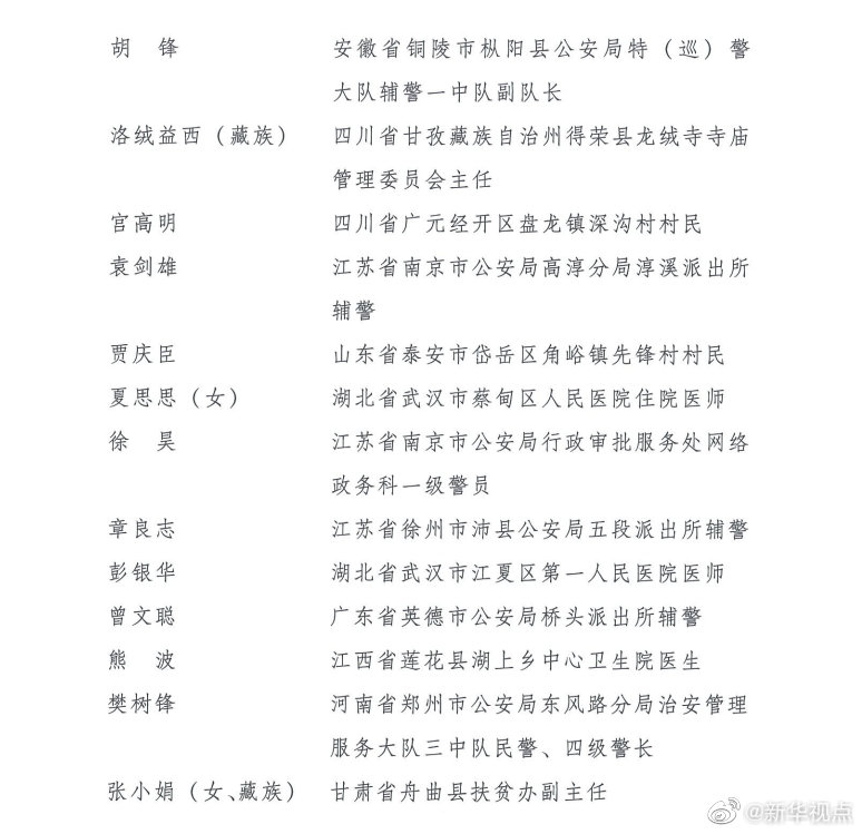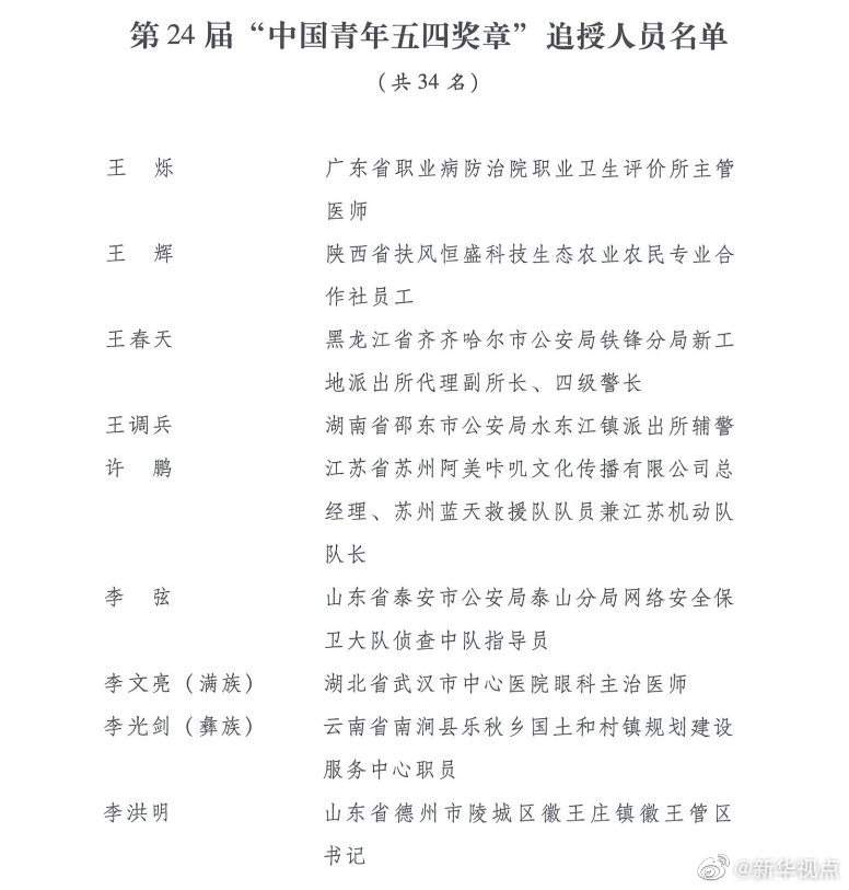 第24屆“中國青年五四獎?wù)隆弊肥谌藛T分別是:廣東省職業(yè)病防治院職業(yè)衛(wèi)生評價所主管醫(yī)師王爍,陜西省扶風(fēng)恒盛科技生態(tài)農(nóng)業(yè)農(nóng)民專業(yè)合作社員工王輝,黑龍江省齊齊哈爾市公安局鐵鋒分局新工地派出所代理副所長、四級警長王春天,湖南省邵東市公安局水東江鎮(zhèn)派出所輔警王調(diào)兵,江蘇省蘇州阿美咔嘰文化傳播有限公司總經(jīng)理、蘇州藍(lán)天救援隊(duì)隊(duì)員兼江蘇機(jī)動隊(duì)隊(duì)長許鵬,山東省泰安市公安局泰山分局網(wǎng)絡(luò)安全保衛(wèi)大隊(duì)偵查中隊(duì)指導(dǎo)員李弦,湖北省武漢市中心醫(yī)院眼科主治醫(yī)師李文亮(滿族),云南省南澗縣樂秋鄉(xiāng)國土和村鎮(zhèn)規(guī)劃建設(shè)服務(wù)中心職員李光劍(彝族),山東省德州市陵城區(qū)徽王莊鎮(zhèn)徽王管區(qū)書記李洪明,內(nèi)蒙古自治區(qū)根河市公安局阿龍山鎮(zhèn)派出所輔警李曉歡,江蘇省徐州市銅山區(qū)公安局巡特警大隊(duì)輔警時席席,浙江省國際貿(mào)易集團(tuán)浙江英特醫(yī)療器械公司維修工程師何旭峰,江蘇省太倉市公安局瀏河派出所三級警長位洪明,湖北省宜昌市秭歸縣沙鎮(zhèn)溪鎮(zhèn)高潮村黨總支書記、村委會主任、民兵連指導(dǎo)員宋青山,湖南省衡山縣東湖鎮(zhèn)馬跡衛(wèi)生院藥劑組副組長宋英杰,四川省紅原縣森林公安局刷經(jīng)寺派出所所長阿真能周(藏族),河南省駐馬店市泌陽縣衛(wèi)生監(jiān)督所監(jiān)督員陳申,云南省昭通市彝良縣奎香鄉(xiāng)寸田村衛(wèi)生室醫(yī)生陳?。ㄅ?,江西省萍鄉(xiāng)市蘆溪縣銀河鎮(zhèn)長竹村衛(wèi)生計生服務(wù)室醫(yī)生陳祥田,中國南方電網(wǎng)云南電網(wǎng)有限責(zé)任公司昆明供電局正值調(diào)度員林芳雯(女、彝族),湖北省武漢特瑞利新材料有限公司出納周友芳(女),安徽省銅陵市樅陽縣公安局特(巡)警大隊(duì)輔警一中隊(duì)副隊(duì)長胡鋒,四川省甘孜藏族自治州得榮縣龍絨寺寺廟管理委員會主任洛絨益西(藏族),四川省廣元經(jīng)開區(qū)盤龍鎮(zhèn)深溝村村民宮高明,江蘇省南京市公安局高淳分局淳溪派出所輔警袁劍雄,山東省泰安市岱岳區(qū)角峪鎮(zhèn)先鋒村村民賈慶臣,湖北省武漢市蔡甸區(qū)人民醫(yī)院住院醫(yī)師夏思思(女),江蘇省南京市公安局行政審批服務(wù)處網(wǎng)絡(luò)政務(wù)科一級警員徐昊,江蘇省徐州市沛縣公安局五段派出所輔警章良志,湖北省武漢市江夏區(qū)第一人民醫(yī)院醫(yī)師彭銀華,廣東省英德市公安局橋頭派出所輔警曾文聰,江西省蓮花縣湖上鄉(xiāng)中心衛(wèi)生院醫(yī)生熊波,河南省鄭州市公安局東風(fēng)路分局治安管理服務(wù)大隊(duì)三中隊(duì)民警、四級警長樊樹鋒,甘肅省舟曲縣扶貧辦副主任張小娟(女、藏族)。