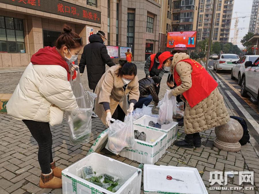 楓樺葦岸社區(qū)第一次開展保供聯(lián)盟,劉宜和志愿者一起分裝蔬菜。(央廣網(wǎng)發(fā) 通訊員供圖)