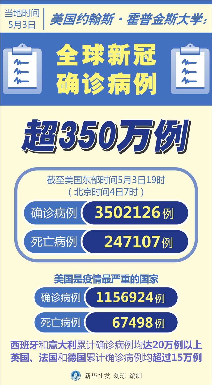 新華社紐約5月3日電 美國(guó)約翰斯·霍普金斯大學(xué)3日發(fā)布的新冠疫情最新統(tǒng)計(jì)數(shù)據(jù)顯示,全球累計(jì)確診病例超過(guò)350萬(wàn)例。