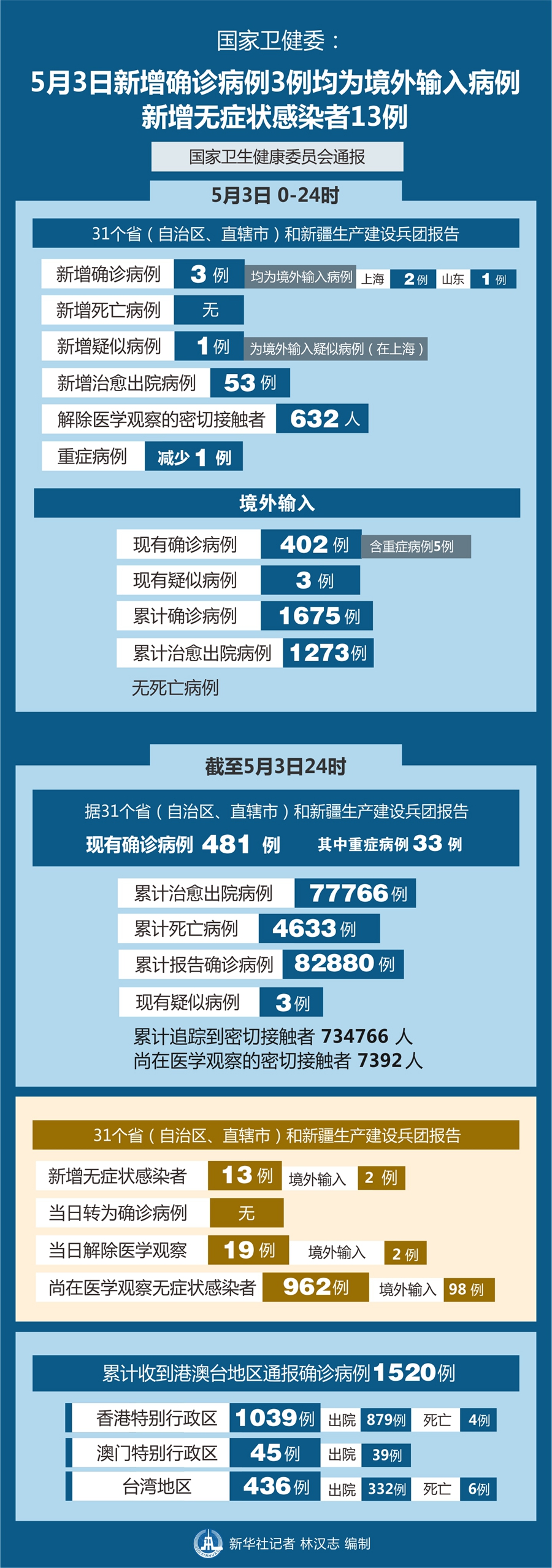 截至5月3日24時(shí),據(jù)31個(gè)?。ㄗ灾螀^(qū)、直轄市)和新疆生產(chǎn)建設(shè)兵團(tuán)報(bào)告,現(xiàn)有確診病例481例(其中重癥病例33例),累計(jì)治愈出院病例77766例,累計(jì)死亡病例4633例,累計(jì)報(bào)告確診病例82880例,現(xiàn)有疑似病例3例。累計(jì)追蹤到密切接觸者734766人,尚在醫(yī)學(xué)觀察的密切接觸者7392人。