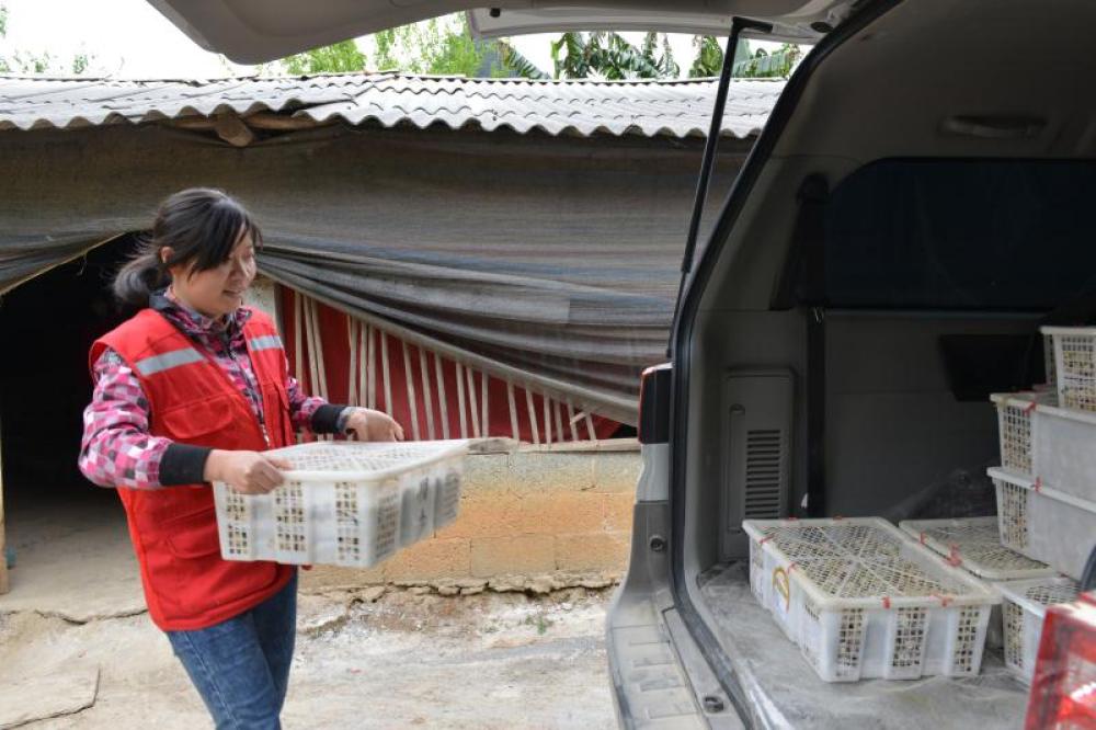 廣西百色市德??h敬德鎮(zhèn)馱信村駐村第一書記李梅在裝運即將出售的鵪鶉蛋(資料照片)。新華社發(fā)