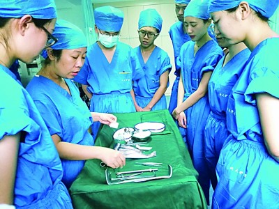 手術(shù)的順利進(jìn)展離不開(kāi)器械護(hù)士的準(zhǔn)確傳遞。圖為北京大學(xué)護(hù)理學(xué)院學(xué)生正在老師引導(dǎo)下認(rèn)識(shí)手術(shù)器械。李珂攝/光明圖片