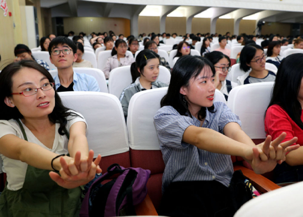 2019年10月11日,上海市青年管理干部學(xué)院,志愿者們?cè)趯W(xué)習(xí)心肺復(fù)蘇術(shù)的正確手法 劉穎/攝