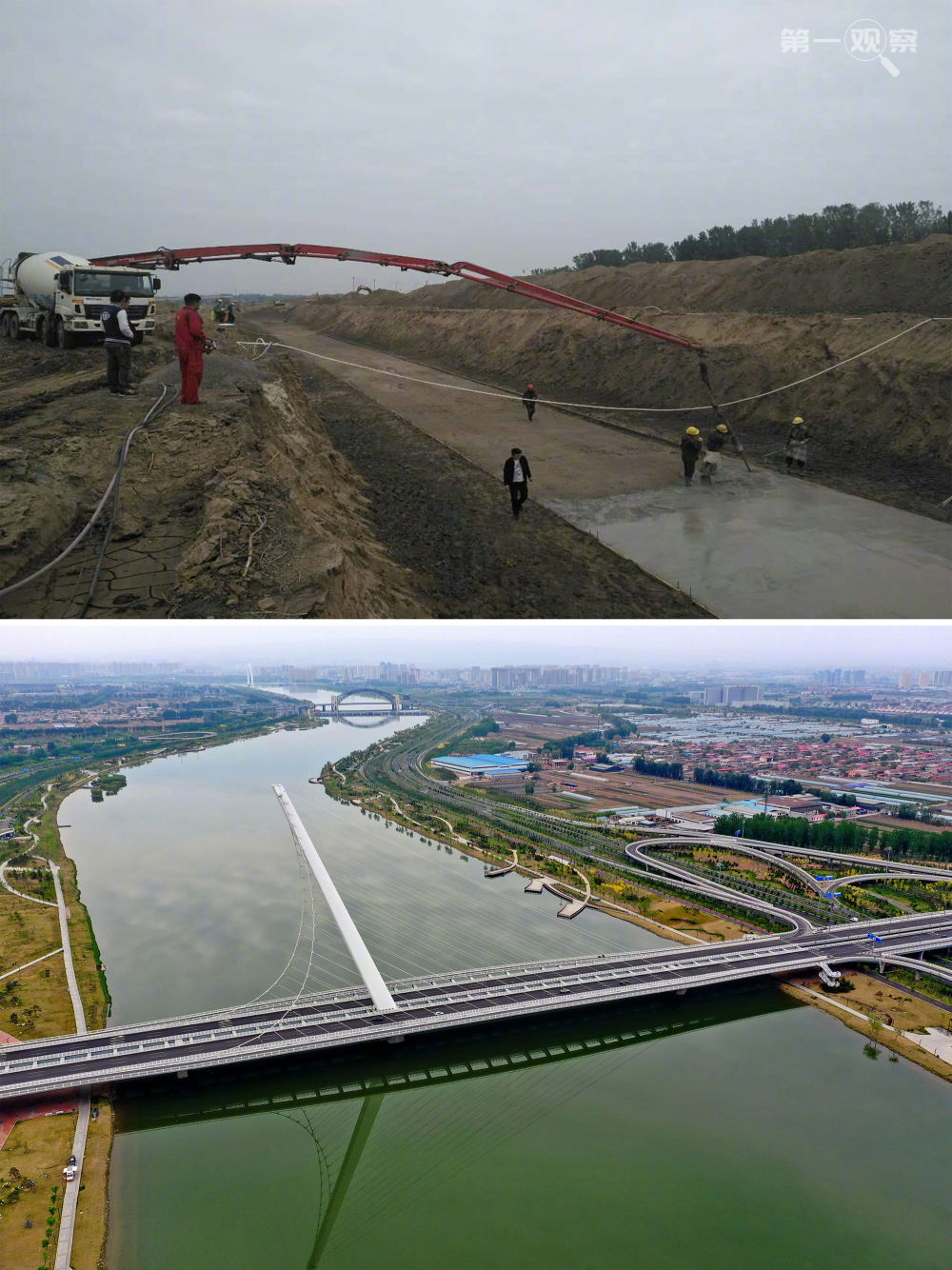 ?↑拼版照片:上圖為2017年10月5日拍攝的太原市汾河城區(qū)段治理美化三期工程施工場景(資料照片);下圖為2020年4月29日無人機(jī)拍攝的太原市汾河兩岸景色(新華社記者 曹陽 攝)。
