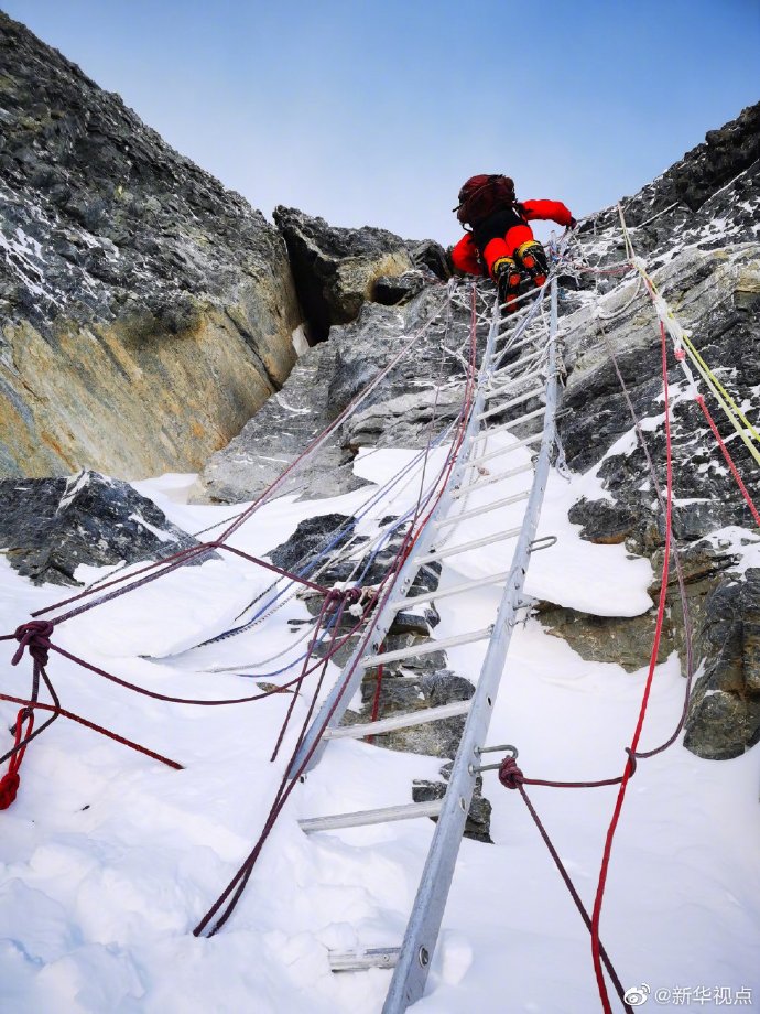2020珠峰高程測量登山隊(duì)隊(duì)員已跨過第二臺階,準(zhǔn)備攀登第三臺階,進(jìn)行沖頂