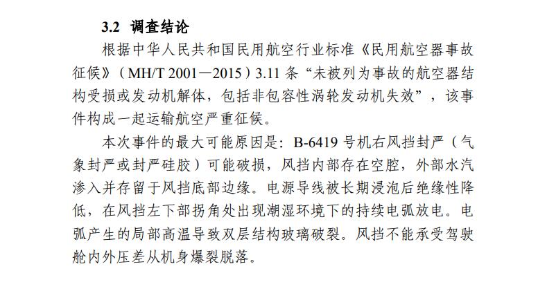 調查報告顯示,本次事件的最大可能原因是:B-6419號機右風擋封嚴(氣象封嚴或封嚴硅膠)可能破損,風擋內部存在空腔,外部水汽滲入并存留于風擋底部邊緣。電源導線被長期浸泡后絕緣性降低,在風擋左下部拐角處出現(xiàn)潮濕環(huán)境下的持續(xù)電弧放電。電弧產生的局部高溫導致雙層結構玻璃破裂。風擋不能承受駕駛艙內外壓差從機身爆裂脫落。