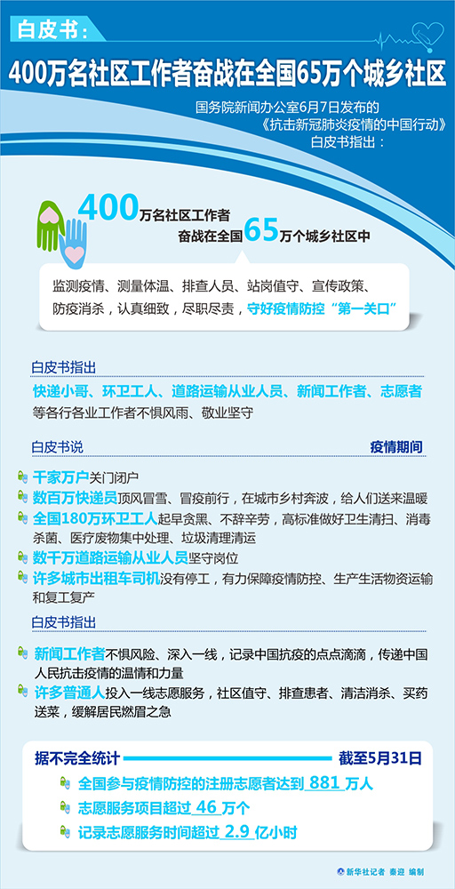 白皮書指出,新聞工作者不懼風險、深入一線,記錄中國抗疫的點點滴滴,傳遞中國人民抗擊疫情的溫情和力量。許多普通人投入一線志愿服務,社區(qū)值守、排查患者、清潔消殺、買藥送菜,緩解居民燃眉之急。據不完全統(tǒng)計,截至5月31日,全國參與疫情防控的注冊志愿者達到881萬人,志愿服務項目超過46萬個,記錄志愿服務時間超過2.9億小時。
