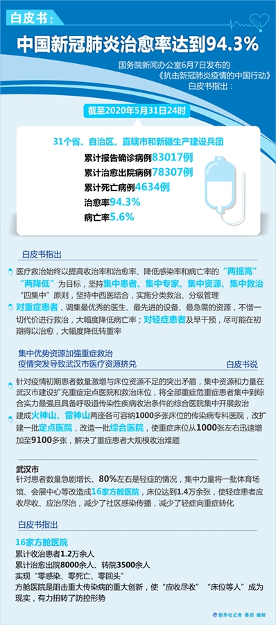 新華社北京6月7日電(記者王秉陽)國務院新聞辦公室7日發(fā)布的《抗擊新冠肺炎疫情的中國行動》白皮書指出,截至2020年5月31日24時,31個省、自治區(qū)、直轄市和新疆生產(chǎn)建設兵團累計報告確診病例83017例,累計治愈出院病例78307例,累計死亡病例4634例,治愈率94.3%,病亡率5.6%。