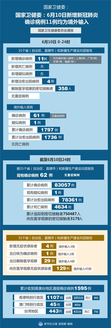 截至6月10日24時(shí),據(jù)31個(gè)?。ㄗ灾螀^(qū)、直轄市)和新疆生產(chǎn)建設(shè)兵團(tuán)報(bào)告,現(xiàn)有確診病例62例(無重癥病例),累計(jì)治愈出院病例78361例,累計(jì)死亡病例4634例,累計(jì)報(bào)告確診病例83057例,現(xiàn)有疑似病例1例。累計(jì)追蹤到密切接觸者750487人,尚在醫(yī)學(xué)觀察的密切接觸者3179人。