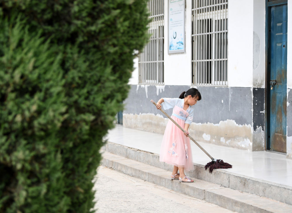 ↑?小思揚放學后在校園里打掃衛(wèi)生。