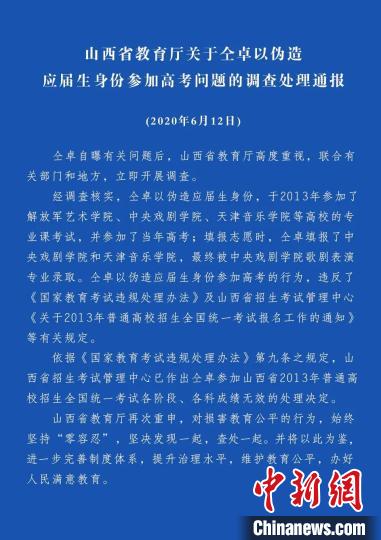 經(jīng)調(diào)查核實(shí),仝卓以偽造應(yīng)屆生身份,于2013年參加解放軍藝術(shù)學(xué)院、中央戲劇學(xué)院、天津音樂學(xué)院等高校的專業(yè)課考試,并參加當(dāng)年高考,被中央戲劇學(xué)院歌劇表演專業(yè)錄取。依據(jù)《國家教育考試違規(guī)處理辦法》第九條之規(guī)定,山西省招生考試管理中心作出仝卓參加山西省2013年普通高校招生全國統(tǒng)一考試各階段、各科成績無效的處理決定。