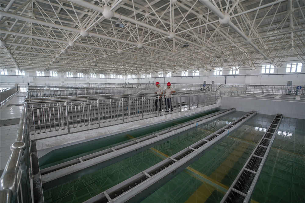 在新疆喀什地區(qū)城鄉(xiāng)供水總水廠(chǎng)里,工作人員檢查清水池工作情況(6月8日攝)。這些安全水將通過(guò)近112公里的主管道直達(dá)伽師縣,供應(yīng)當(dāng)?shù)鼐用裼盟?/span>新華社記者 趙戈 攝