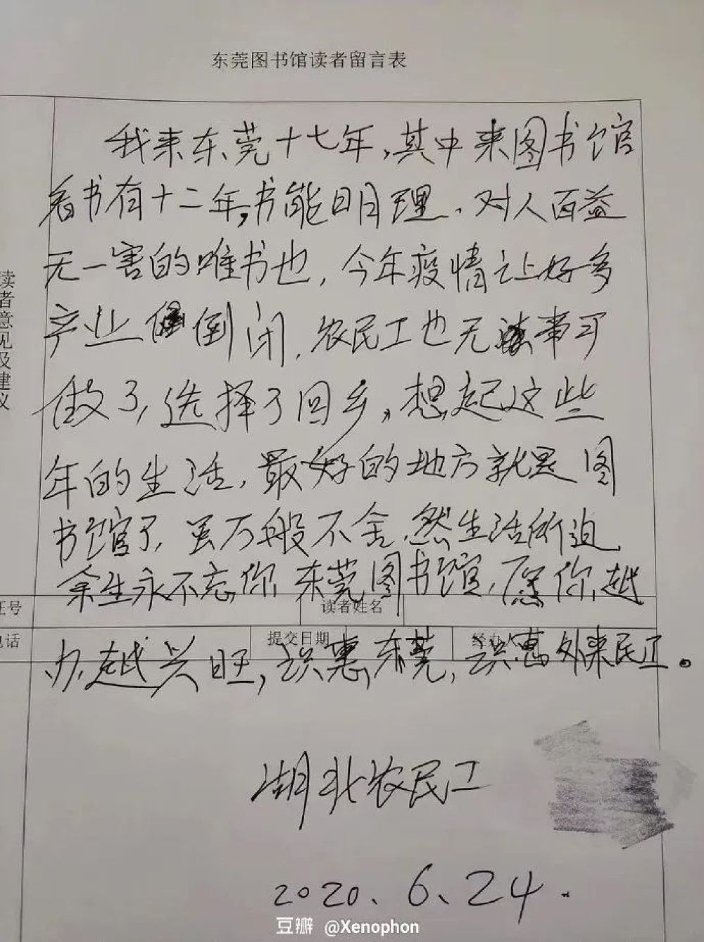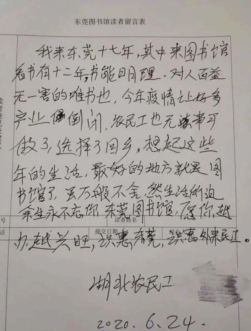 “我來東莞十七年,其中來圖書館看書有十二年。書能明理,對人百益無一害的唯書也。今年疫情讓好多產業(yè)(企業(yè))倒閉,農民工也無事可做了,選擇了回鄉(xiāng)。想起這些年的生活,最好的地方就是圖書館了。雖萬般不舍,然生活所迫,余生永不忘你,東莞圖書館,愿你越辦越興旺。識惠東莞,識惠外來農民工?!?/span>