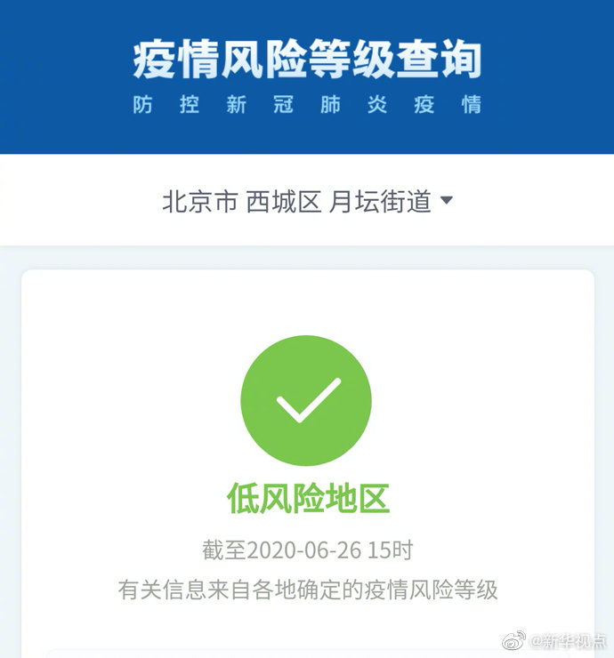 根據(jù)國務(wù)院客戶端小程序“疫情風(fēng)險(xiǎn)等級(jí)查詢”,截至6月26日15時(shí),北京市西城區(qū)月壇街道由中風(fēng)險(xiǎn)地區(qū)變更為低風(fēng)險(xiǎn)地區(qū)。海淀區(qū)四季青(地區(qū))鎮(zhèn)、昌平區(qū)回龍觀街道升級(jí)為中風(fēng)險(xiǎn)地區(qū)。