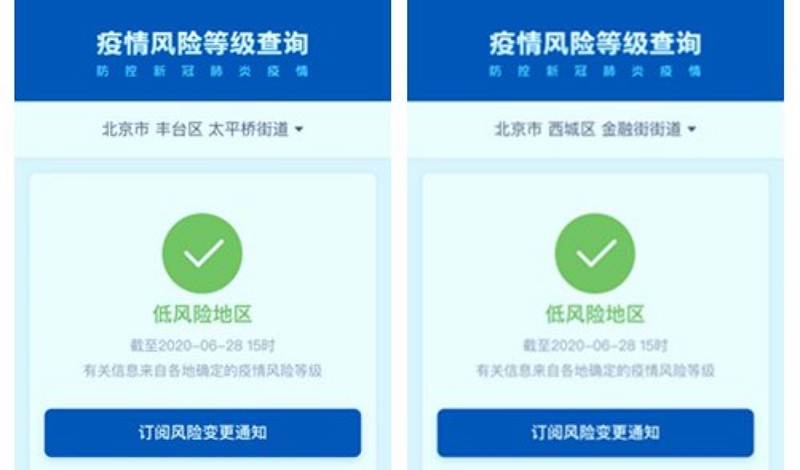 記者從國(guó)務(wù)院客戶端小程序“疫情風(fēng)險(xiǎn)等級(jí)查詢”上了解到,截至6月28日15時(shí),北京市西城區(qū)金融街街道、豐臺(tái)區(qū)太平橋街道由疫情中風(fēng)險(xiǎn)地區(qū)變更為低風(fēng)險(xiǎn)地區(qū)。