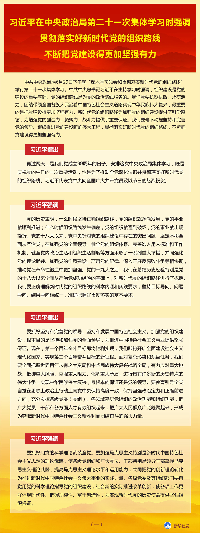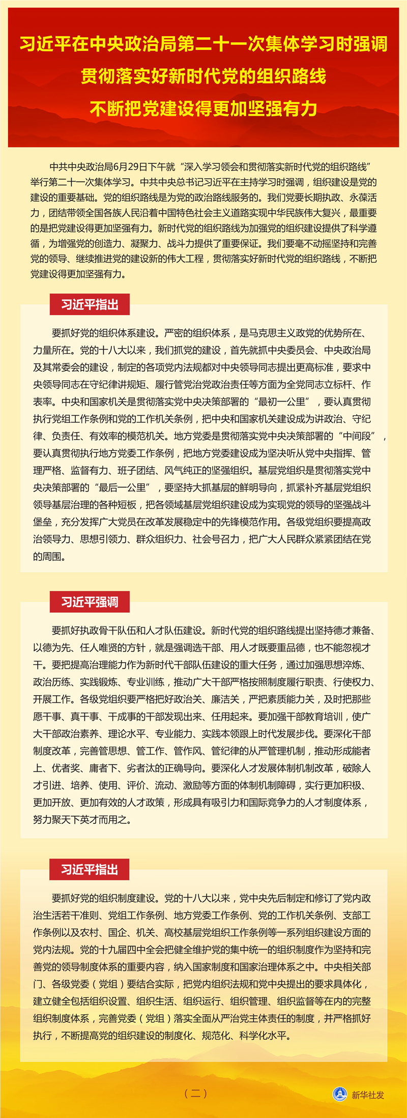 新華社北京6月30日電 中共中央政治局6月29日下午就“深入學習領(lǐng)會和貫徹落實新時代黨的組織路線”舉行第二十一次集體學習。中共中央總書記習近平在主持學習時強調(diào),組織建設(shè)是黨的建設(shè)的重要基礎(chǔ)。黨的組織路線是為黨的政治路線服務(wù)的。我們黨要長期執(zhí)政、永葆活力,團結(jié)帶領(lǐng)全國各族人民沿著中國特色社會主義道路實現(xiàn)中華民族偉大復(fù)興,最重要的是把黨建設(shè)得更加堅強有力。新時代黨的組織路線為加強黨的組織建設(shè)提供了科學遵循,為增強黨的創(chuàng)造力、凝聚力、戰(zhàn)斗力提供了重要保證。我們要毫不動搖堅持和完善黨的領(lǐng)導(dǎo)、繼續(xù)推進黨的建設(shè)新的偉大工程,貫徹落實好新時代黨的組織路線,不斷把黨建設(shè)得更加堅強有力。