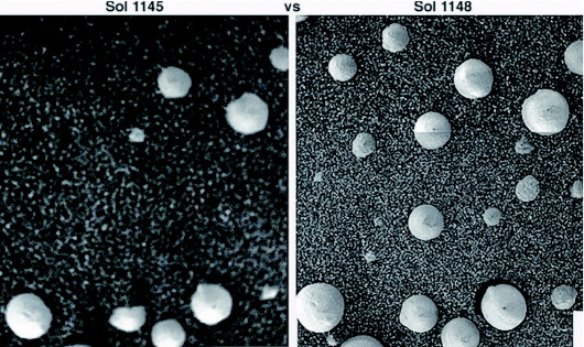 在巖層頂部的這些“生命”是集體定向的,帽子和莖向上傾斜,像沖著某個(gè)光源進(jìn)行光合作用。此外,“機(jī)遇號”還拍到了在無風(fēng)情況下,12個(gè)球形“生命”冒出土壤,另外11個(gè)“生命”在三天內(nèi)明顯長大的照片。