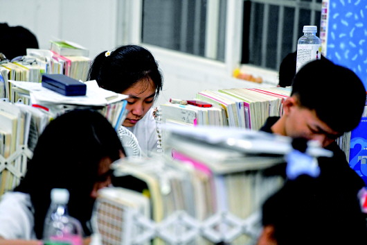 在湖南岳陽平江縣第二中學(xué),向欣儀(中)在教室復(fù)習(xí)功課,備戰(zhàn)高考(7月3日攝)。記者陳澤國攝