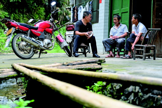 在湖南岳陽平江縣大洲鄉(xiāng)上洲村,向彩旺(左)在貧困戶家中了解情況(7月3日攝)。記者陳澤國攝