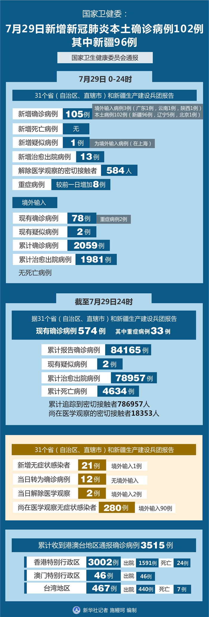 截至7月29日24時,據(jù)31個?。ㄗ灾螀^(qū)、直轄市)和新疆生產(chǎn)建設(shè)兵團報告,現(xiàn)有確診病例574例(其中重癥病例33例),累計治愈出院病例78957例,累計死亡病例4634例,累計報告確診病例84165例,現(xiàn)有疑似病例2例。累計追蹤到密切接觸者786957人,尚在醫(yī)學(xué)觀察的密切接觸者18353人。