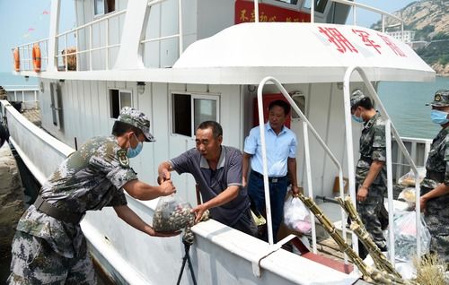 7月16日,“泰叔”錢均堂(左二)在“擁軍船”靠岸蘇山島后搬運(yùn)送給部隊(duì)官兵的慰問品。新華社記者 王凱 攝