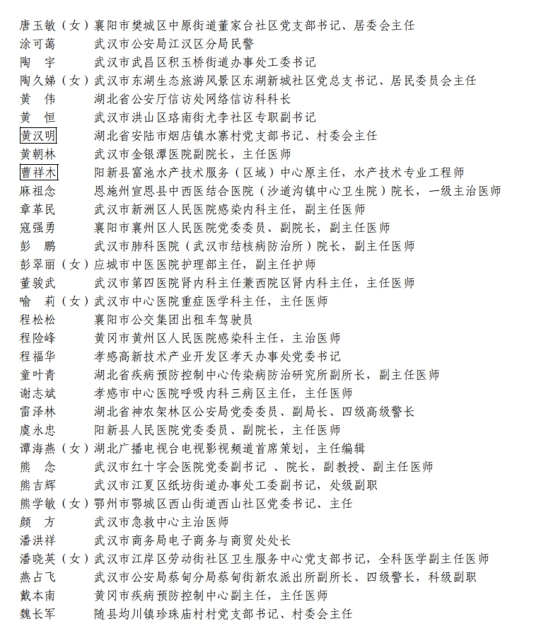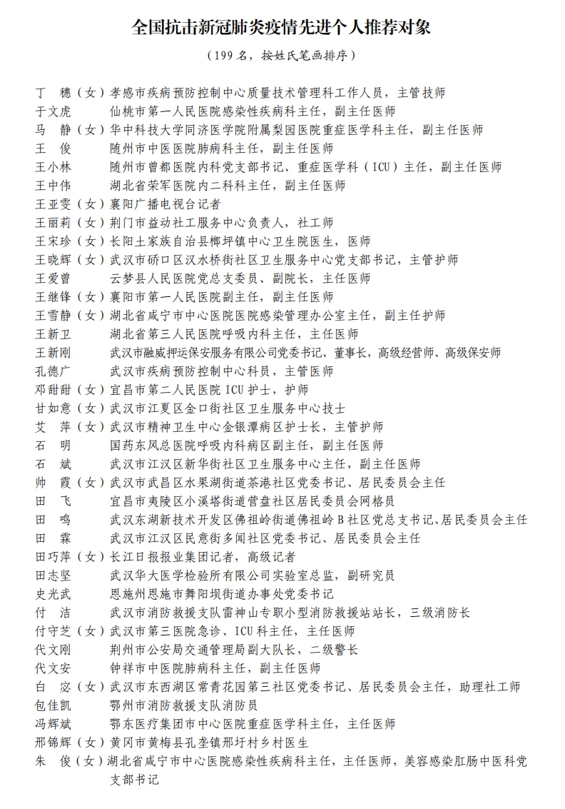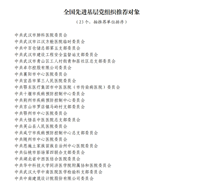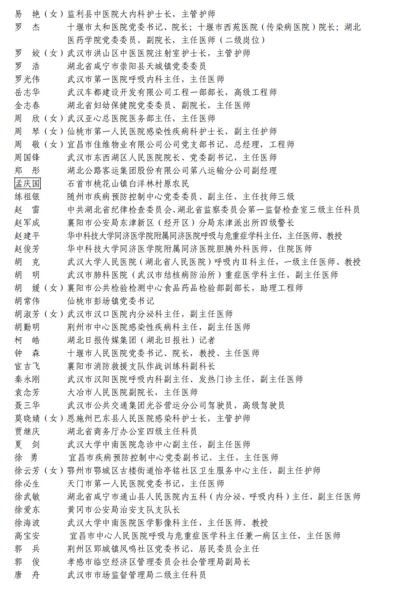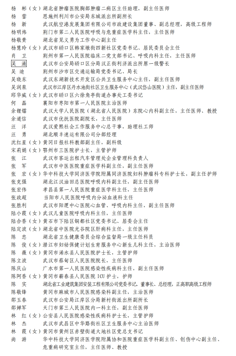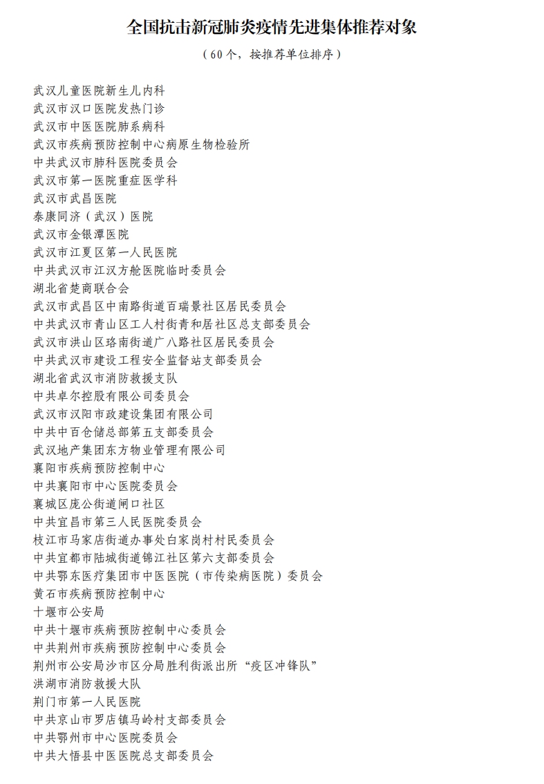 據(jù)湖北省人民政府網(wǎng)站消息,5日,湖北省人民政府發(fā)布關(guān)于全國抗擊新冠肺炎疫情先進個人、先進集體和全國優(yōu)秀共產(chǎn)黨員、全國先進基層黨組織推薦對象的公示。武漢市武昌醫(yī)院原黨委副書記、院長,主任醫(yī)師劉智明等入選。