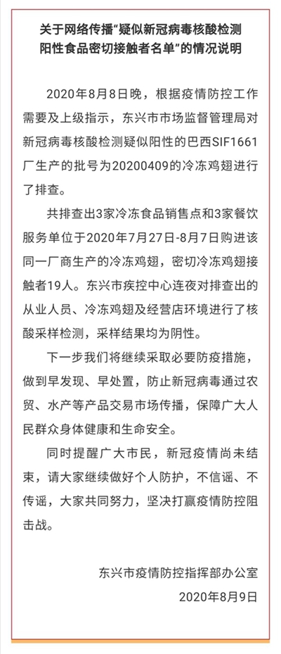 8月9日,記者從東興市疫情防控指揮部辦公室了解到, 8月8日晚,根據(jù)疫情防控工作需要及上級(jí)指示,東興市市場(chǎng)監(jiān)督管理局對(duì)新冠病毒核酸檢測(cè)疑似陽(yáng)性的巴西SIF1661廠生產(chǎn)的批號(hào)為20200409的冷凍雞翅進(jìn)行了排查,共排查出3家冷凍食品銷售點(diǎn)和3家餐飲服務(wù)單位于2020年7月27日—8月7日購(gòu)進(jìn)該同一廠商生產(chǎn)的冷凍雞翅,密切冷凍雞翅接觸者19人。東興市疾控中心連夜對(duì)排查出的從業(yè)人員、冷凍雞翅及經(jīng)營(yíng)店環(huán)境進(jìn)行了核酸采樣檢測(cè),采樣結(jié)果均為陰性。