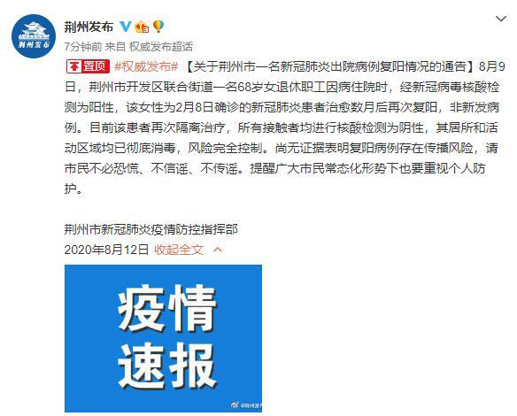 據(jù)湖北省荊州市新冠肺炎疫情防控指揮部12日通報(bào),8月9日,荊州市開發(fā)區(qū)聯(lián)合街道一名68歲女退休職工因病住院時(shí),經(jīng)新冠病毒核酸檢測為陽性,該女性為2月8日確診的新冠肺炎患者治愈數(shù)月后再次復(fù)陽,非新發(fā)病例。目前該患者再次隔離治療,所有接觸者均進(jìn)行核酸檢測為陰性,其居所和活動(dòng)區(qū)域均已徹底消毒,風(fēng)險(xiǎn)完全控制。尚無證據(jù)表明復(fù)陽病例存在傳播風(fēng)險(xiǎn),請市民不必恐慌、不信謠、不傳謠。提醒廣大市民常態(tài)化形勢下也要重視個(gè)人防護(hù)。