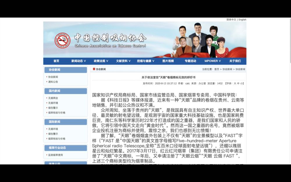 針對“天眼”被煙草企業(yè)注冊商標并使用一事,中國控制吸煙協(xié)會8月13日在其官網發(fā)布聲明,希望國家知識產權局商標局等部門對此事予以關注。