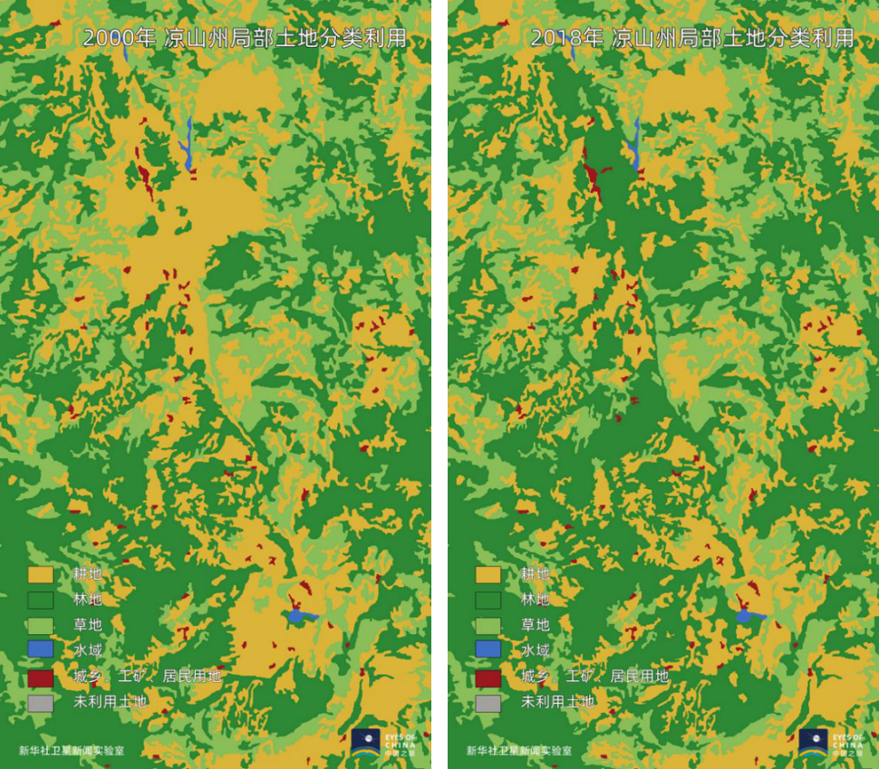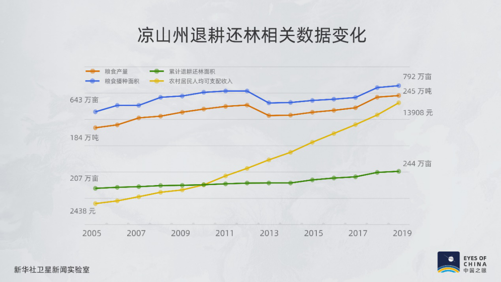 退耕還林后,涼山的實(shí)際播種面積從2004年的約600萬(wàn)畝,增加到2019年的780萬(wàn)畝。