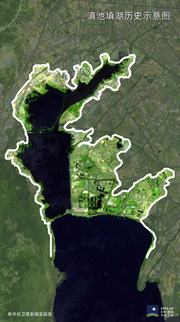 ↑滇池北部填湖示意圖,白線(xiàn)內(nèi)土地為上世紀(jì)60年代后填湖所得。